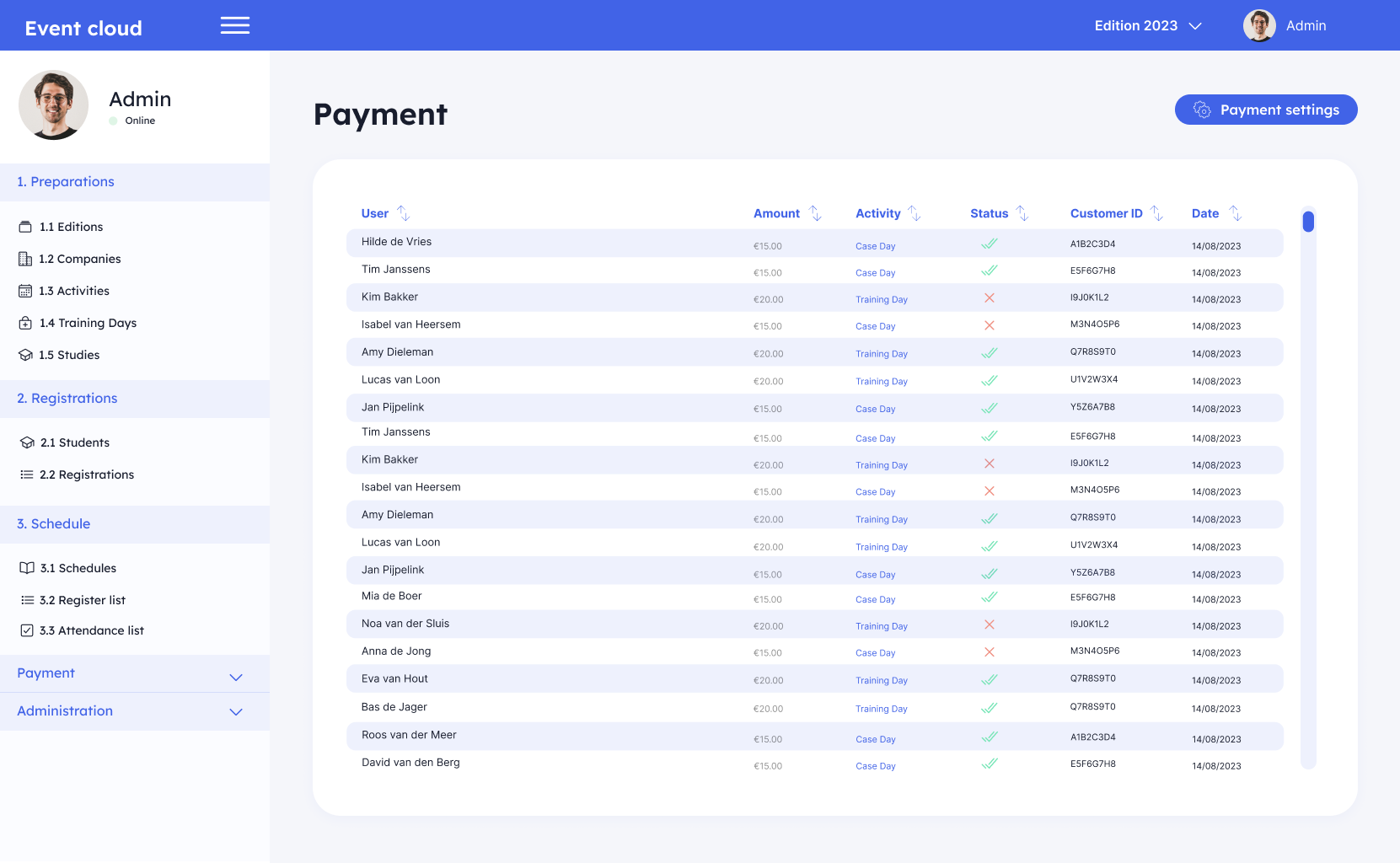 We offer the possibility to connect to Mollie for SEPA payments. With SEPA your Event can set Participation Fees, No Show Fees, and fees per extra activity.