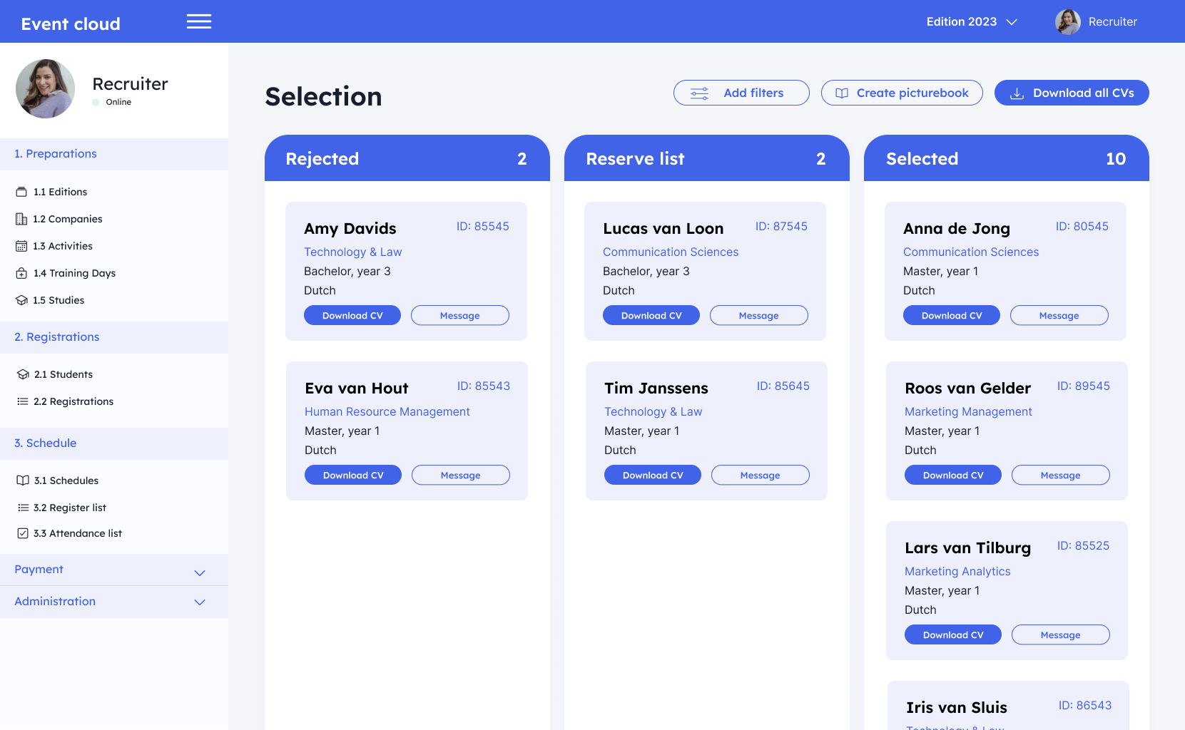 Together with the Company Recruiters you can select the best students per event. We also offer resumé view and Anonymous resumé view for recruiters.